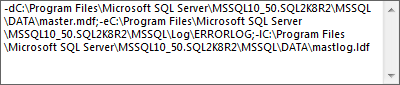 - A Startup Parameters tulajdonságnál át kell állítani az elérési útvonalat a master.mdf és master.ldf file-okra