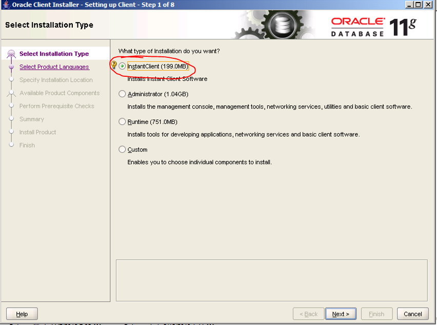 - A letöltött ORA Client setup.exe elindítása után a InstantClient opciót kell választani, majd Next.