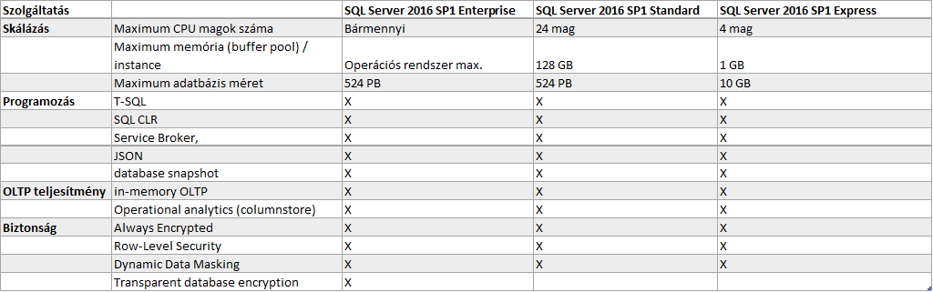 Ez szerintem több, nagyon régen várt megoldást hoz. Innentől kezdve nem csak Enterprise Edition amiben elérhető minden szolgáltatás és funkció! Az alábbi táblázatban próbáltam összefoglalni a fontosabbakat, a teljes lista és a pontos részletek itt érhetőek el.