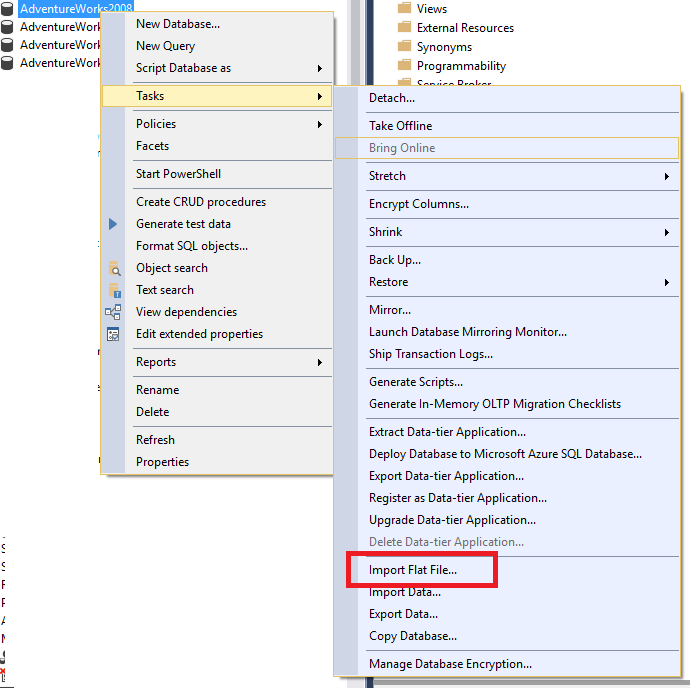Ezt a funkciót az adatbázison jobb gombot nyomva a Tasks --> import Flat File menüpontra kattintva érhetjük el.