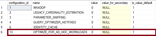 1ALTER DATABASE SCOPED CONFIGURATION SET OPTIMIZE_FOR_AD_HOC_WORKLOADS = ON;